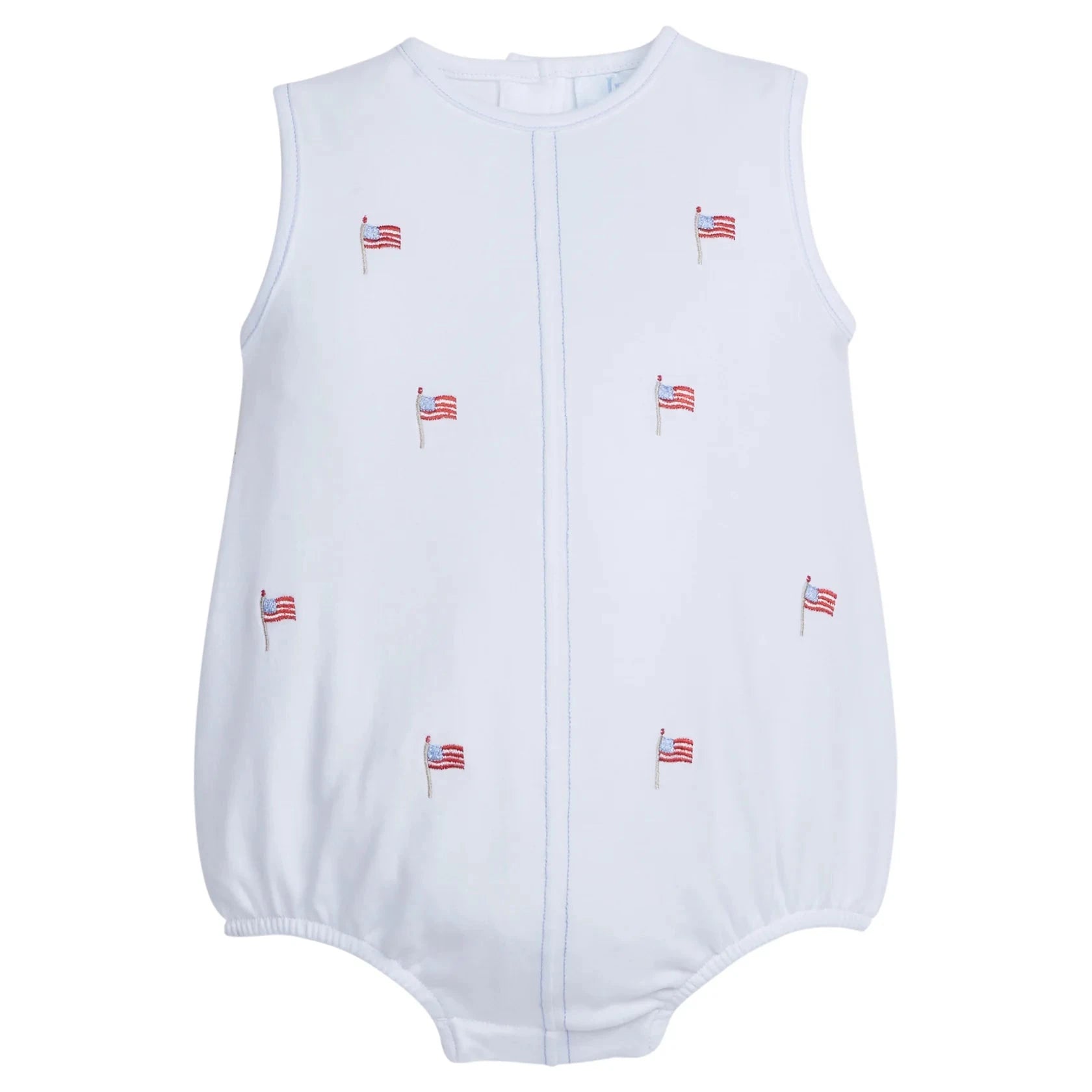 Made from the softest white cotton, our Embroidered Bubble - Flags features rows of American flags down the front with blue thread detailing. This bubble is a fun and traditional Fourth of July outfit for your little one and sister can easily match in our Suzy Dress - Flags!