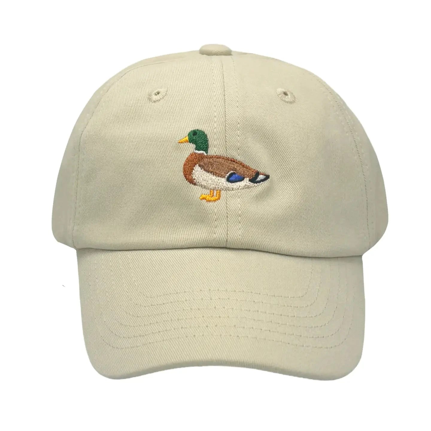 A playfully polished khaki baseball hat with mallard duck embroidery and navy plaid tuckstrap. * Soft-structured 6-panel baseball hat * Tuck strap with metal slide closure * 100% Cotton * Baby-sized cap fits most children from ages 6-24 months old * Youth-sized cap fits most children from ages 2-7 years old